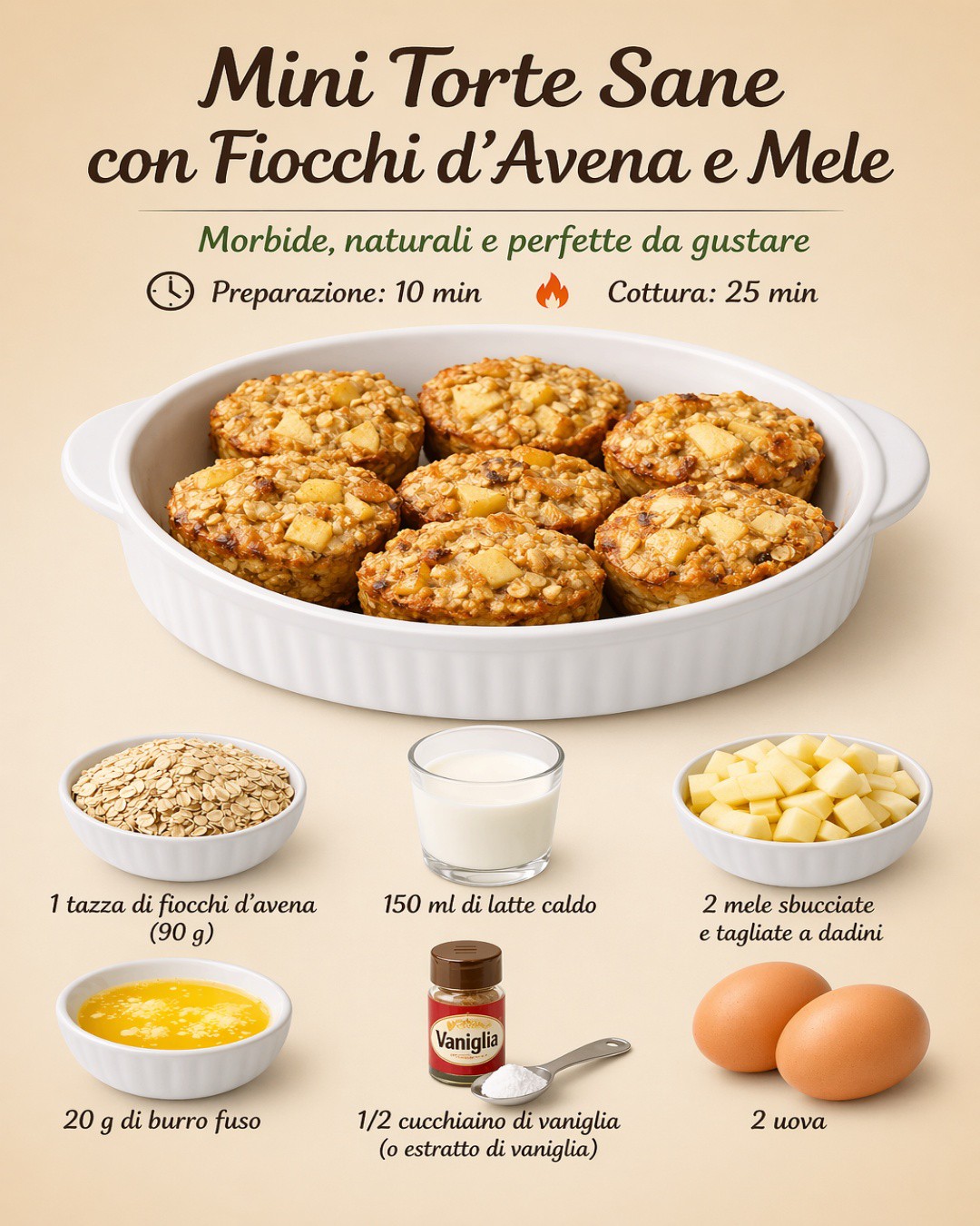 Queste mini torte sane con fiocchi d’avena e mele sono una proposta semplice, morbida e naturale, perfetta per una pausa dolce equilibrata. La consistenza soffice dell’avena si unisce alla dolcezza della mela in una ricetta genuina e piacevole da gustare in ogni momento della giornata.