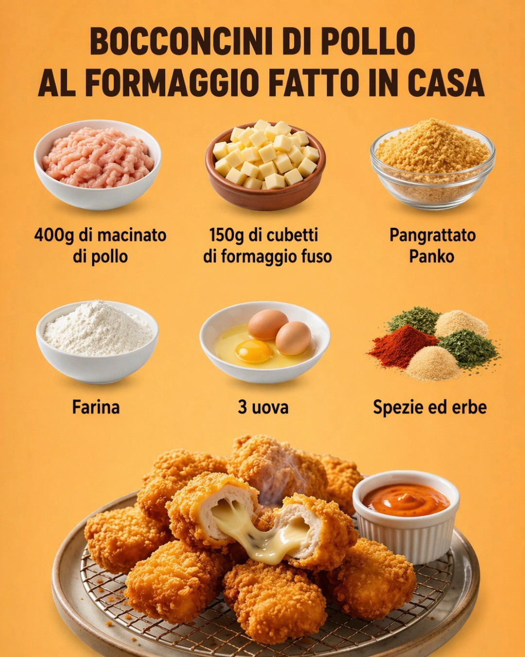 Croccanti fuori e filanti dentro, questi bocconcini di pollo al formaggio sono una ricetta sfiziosa e facile da preparare in casa. Perfetti per un pranzo saporito o per una cena informale, uniscono una panatura dorata a un cuore morbido e gustoso.