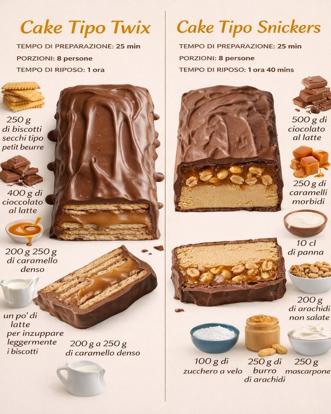 Due dolci senza cottura dall’aspetto ricco e goloso, perfetti per chi ama i dessert cremosi e pieni di carattere. In questa versione la foto propone due idee diverse ma affini: un cake tipo Twix con biscotti, caramello e cioccolato al latte, e un cake tipo Snickers con crema, arachidi e caramello.