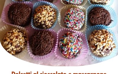 Dolcetti al cioccolato,e mascarponeIngredienti:350 g di biscotti al cioccolato frullati in polvere250 g di mascarpone2 cucchiaini di zuccheroGranelle assortite
