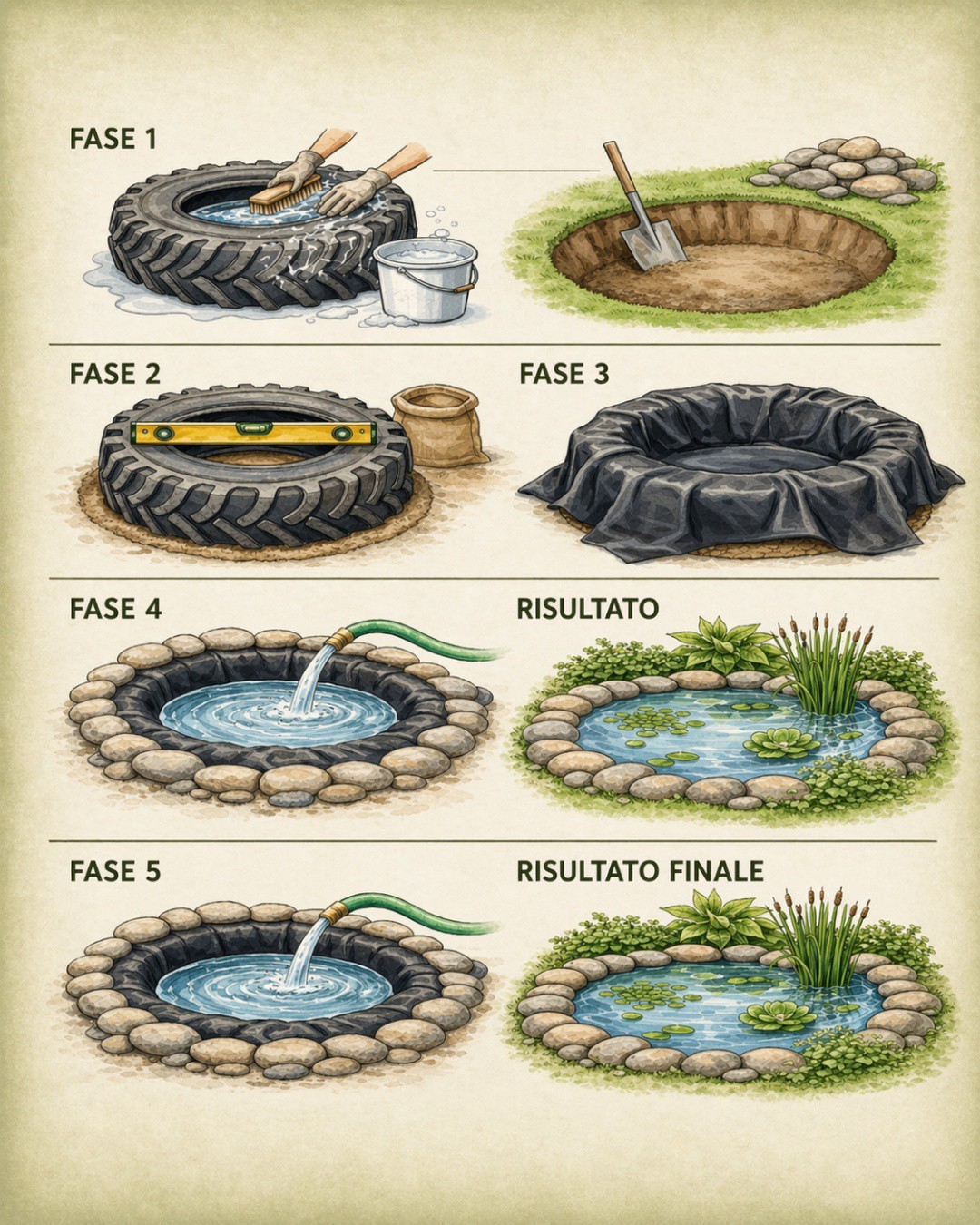 Creare un piccolo laghetto in giardino è un’idea semplice che valorizza lo spazio esterno e aggiunge un tocco naturale molto decorativo. L’immagine mostra un progetto creativo e accessibile, perfetto per trasformare materiali di recupero in un angolo verde piacevole da vedere.