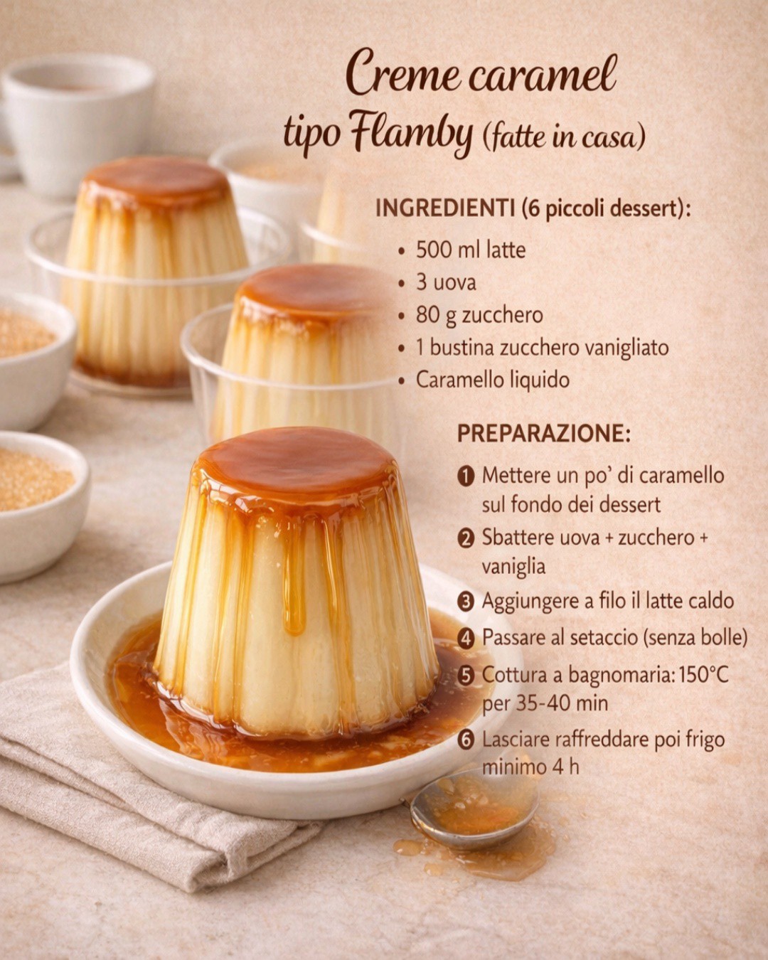 Il creme caramel tipo Flamby fatto in casa è un dessert semplice, delicato e sempre elegante, perfetto per chi ama i dolci al cucchiaio morbidi e vellutati. Il contrasto tra la crema liscia e il caramello fluido crea un risultato classico, equilibrato e molto piacevole.