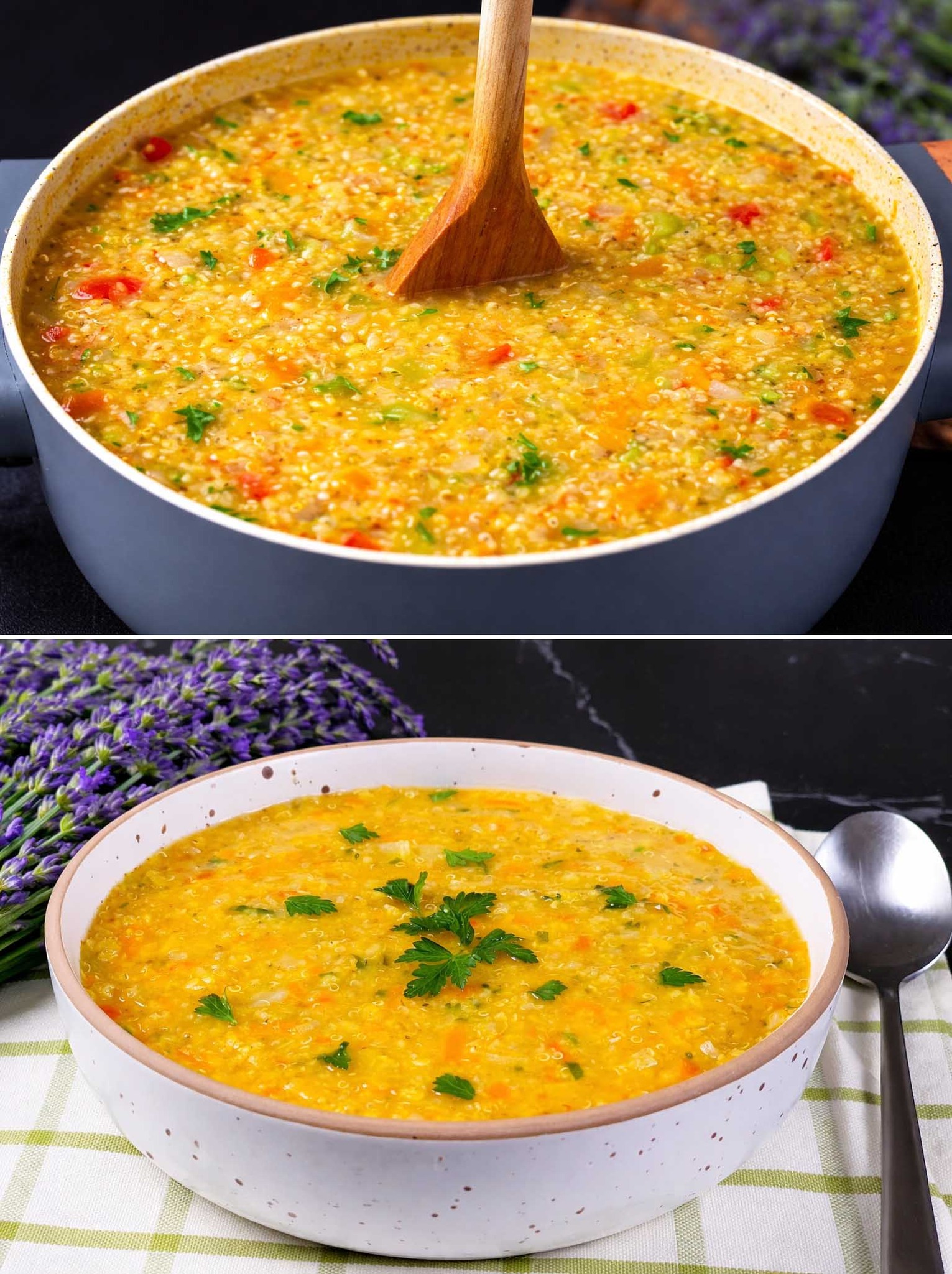 Questa è una di quelle zuppe che faccio quando sento proprio il bisogno di qualcosa di nutriente. Non leggero-triste, ma caldo, speziato, che ti riempie senza appesantire. La prima volta l’ho preparata un po’ a intuito, mescolando lenticchie rosse, quinoa e quello che avevo nel cassetto delle spezie. Il risultato? Una zuppa profumata, cremosa al punto giusto, che ti fa sentire sazia e “a posto” già dopo il primo piatto.