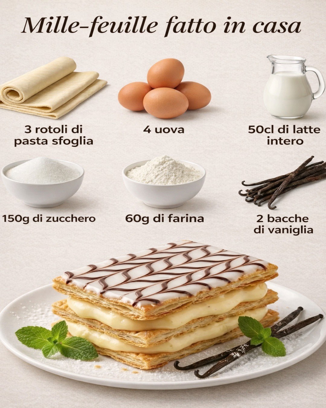 Un classico della pasticceria che conquista per il contrasto tra sfoglia croccante e crema vellutata. Questa versione fatta in casa mantiene tutta l’eleganza del dolce originale con una preparazione chiara e ben strutturata.