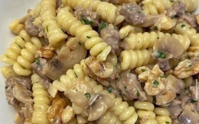 Ricetta FUSILLI CON SALSICCIA, FUNGHI E NOCI Ingredienti:Fusilli 200gSalsiccia 1Funghi 200gNoci 4