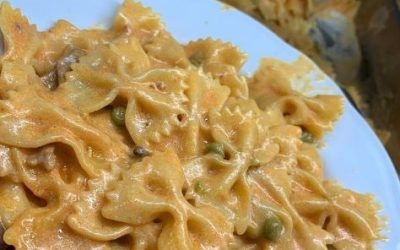 FARFALLE ALLA BOSCAIOLA200g di farfalle;100g funghi champignon;100g pisellini;350g di passata di pomodoro;1 confezione di panna da cucina;cipolla q.b.;sale q.b.;olio EVO…