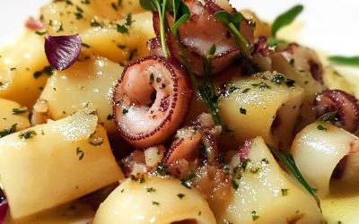 Calamarata con Crema di Patate e Polpo Ingredienti:2 polpi, bolliti, raffreddati e tagliati a pezzetti2 patate, lessate e sbucciate (una…