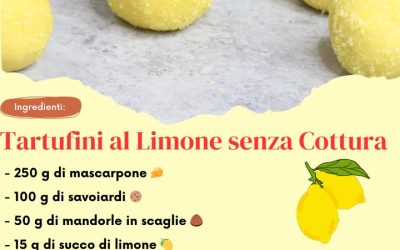 Tartufini al Limone senza Cotturac **Ingredienti:**- 250 g di mascarpone - 100 g di savoiardi - 50 g di mandorle…