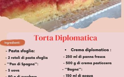 Torta Diplomatica Ingredienti:- **Pasta sfoglia**:- 2 rotoli di pasta sfoglia- **Pan di Spagna**:- 3 uova- 90 g di zucchero- 45…