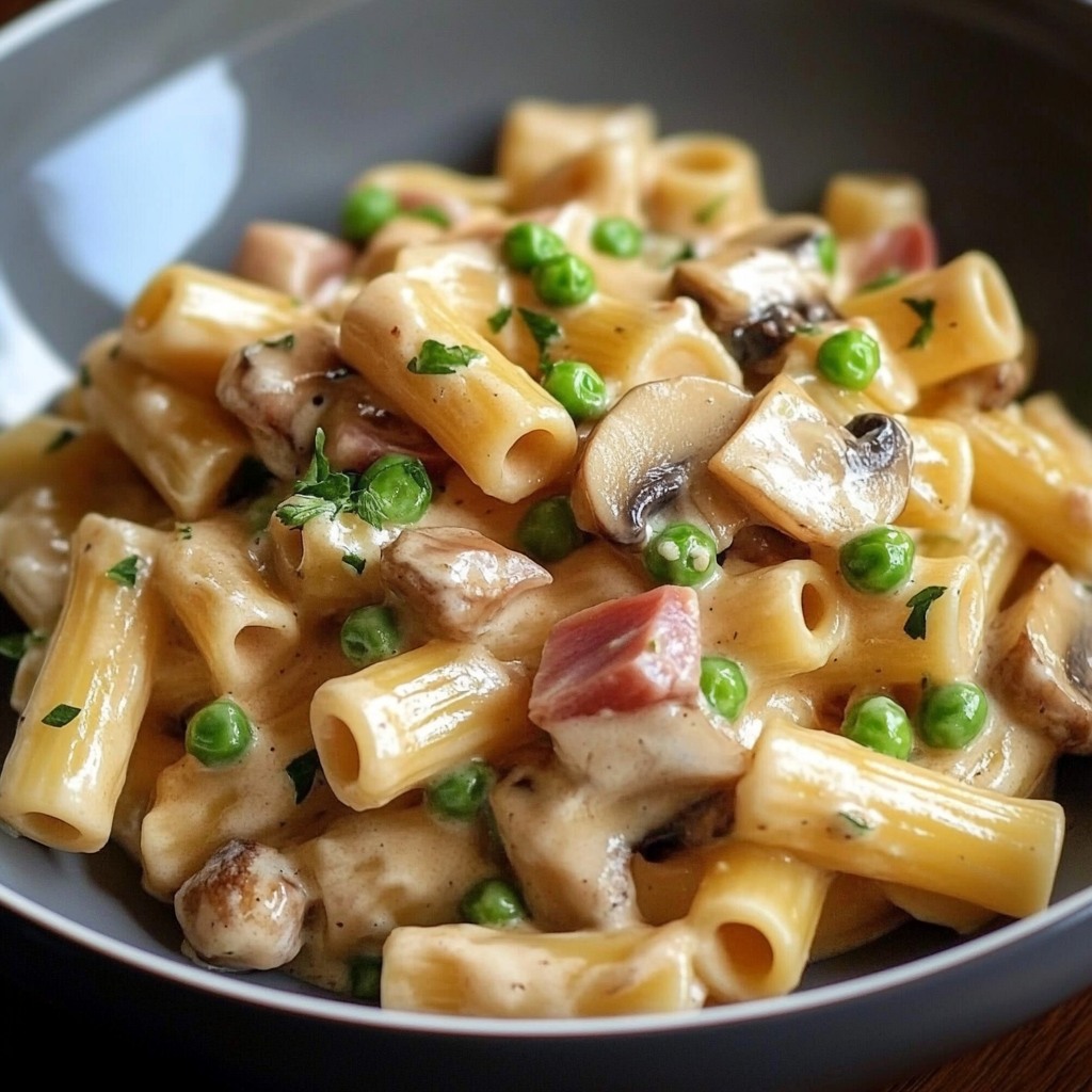 Una ricetta ricca e cremosa che conquisterà tutti! La delicatezza della panna si mescola perfettamente con il gusto deciso dei funghi, il prosciutto croccante e la dolcezza dei piselli. Perfetta per un pranzo o una cena in famiglia! ![]()