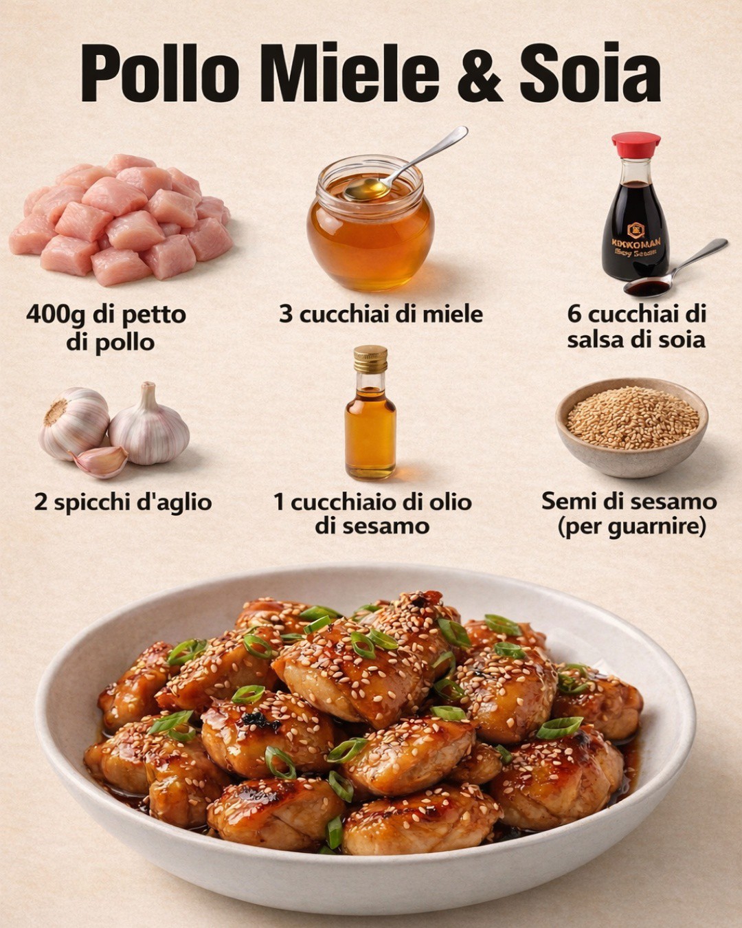 Il pollo miele e soia è un secondo piatto semplice e ricco di sapore, perfetto per portare in tavola qualcosa di gustoso con pochi ingredienti. La combinazione tra miele, salsa di soia, aglio e olio di sesamo crea una glassa intensa e avvolgente che rende il pollo morbido e profumato.