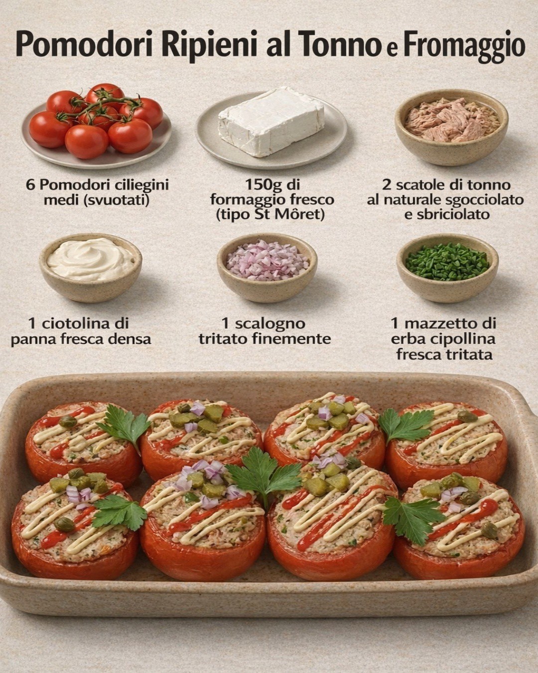 Questi pomodori ripieni al tonno e formaggio sono freschi, cremosi e molto piacevoli da servire come antipasto o piatto leggero. La farcitura unisce la delicatezza del formaggio fresco al gusto del tonno, con un risultato semplice ma ben equilibrato.