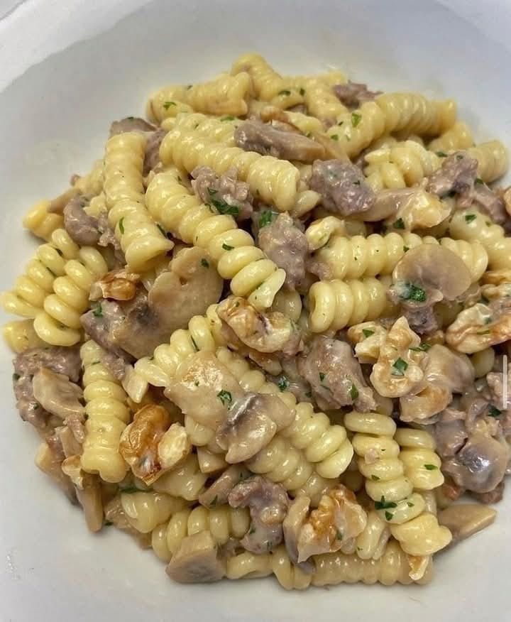 FUSILLI CON SALSICCIA, FUNGHI E NOCI