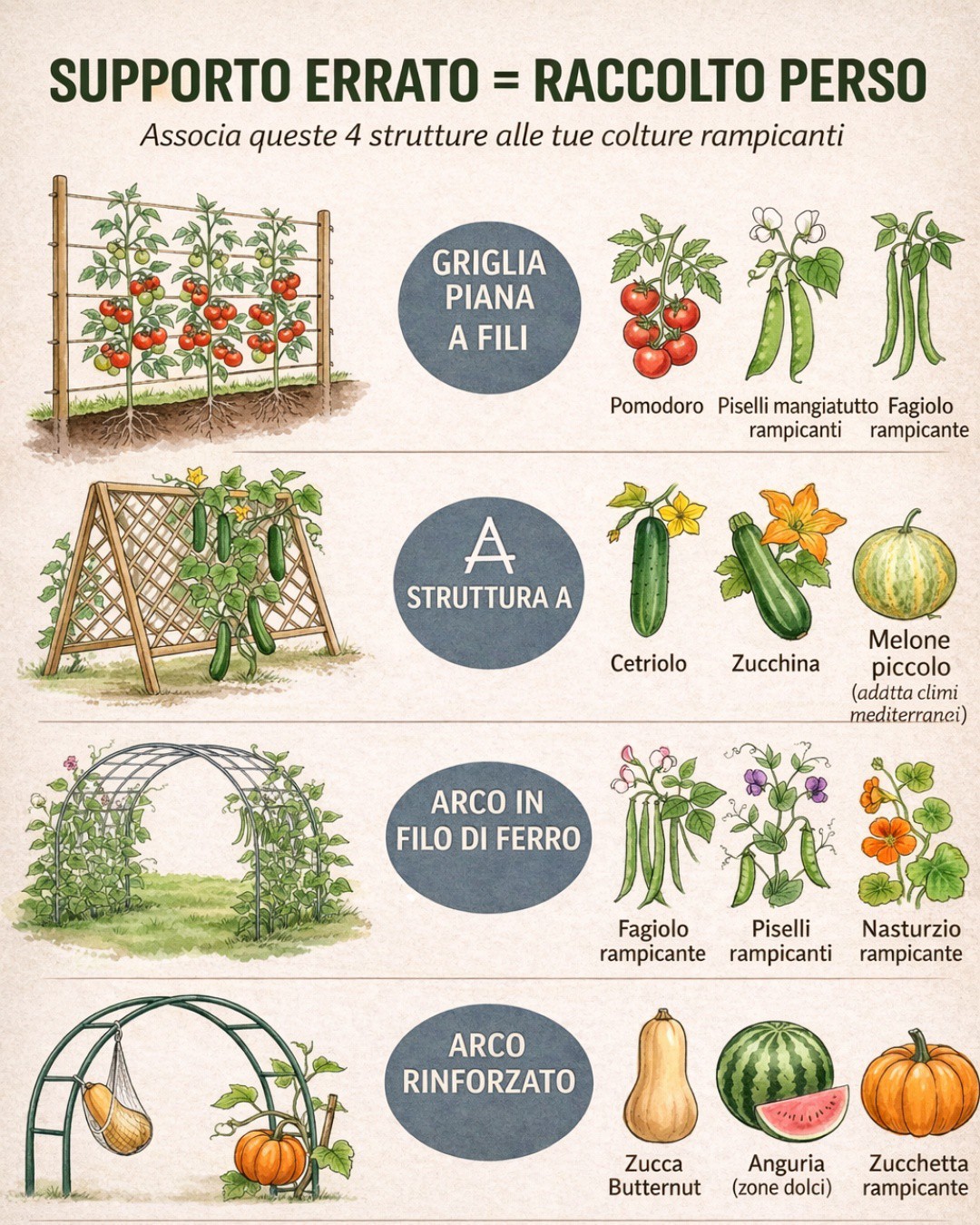 Quando una pianta rampicante cresce sul supporto adatto, si sviluppa meglio, si arieggia di più e produce con maggiore regolarità. Scegliere la struttura corretta non è solo una questione di ordine, ma un vero aiuto per la salute e la produttività dell’orto.