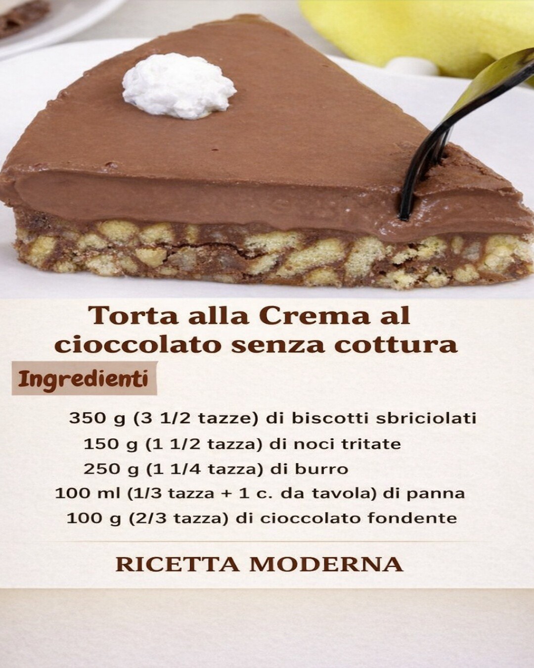 Questa torta senza cottura è una proposta semplice e golosa, con una base ricca di biscotti e noci e una crema al cioccolato morbida e avvolgente. È un dolce pratico da preparare, perfetto per chi desidera un dessert intenso e cremoso senza usare il forno.