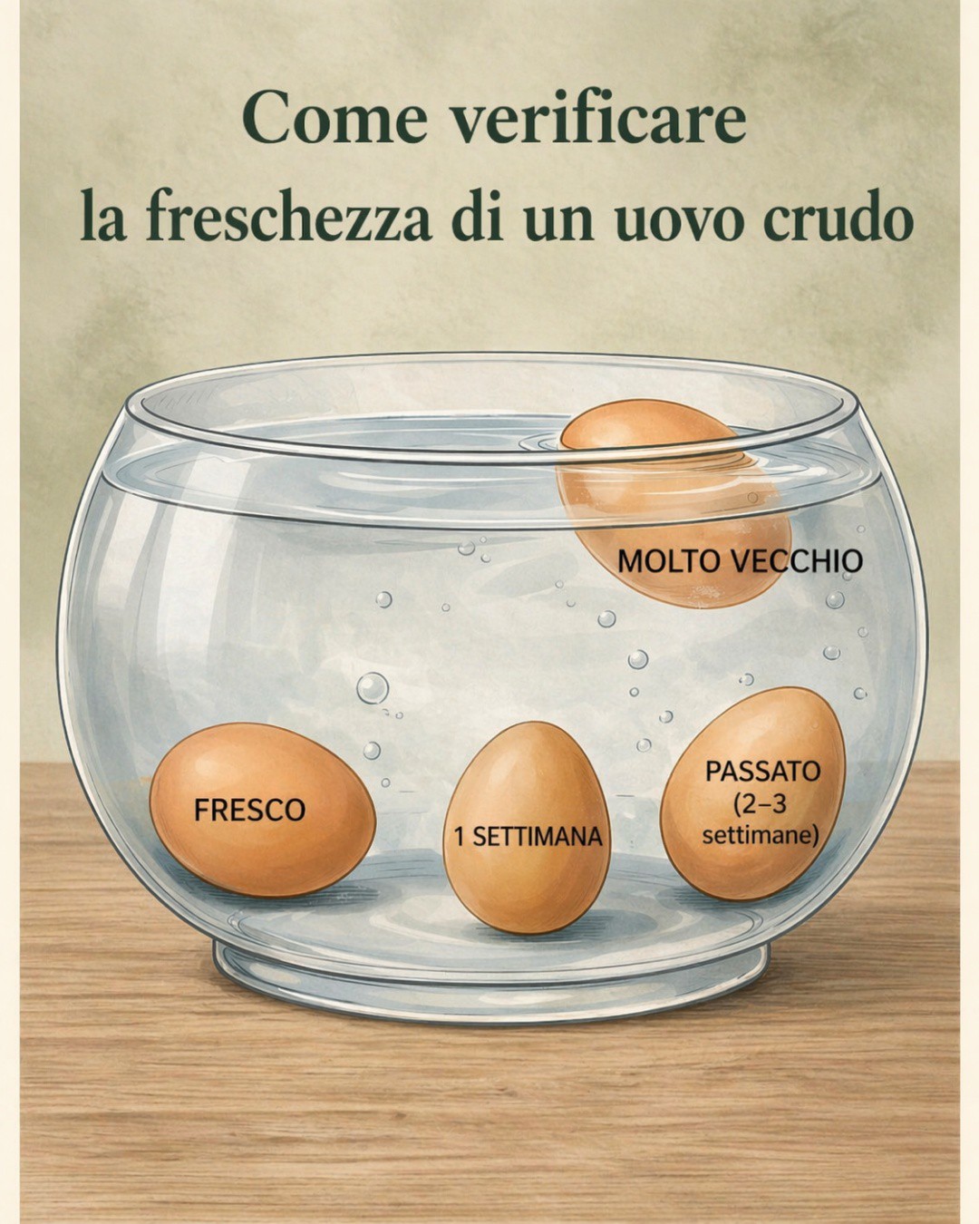 Un controllo semplice può aiutare a capire meglio lo stato di un uovo crudo prima dell’uso. L’immagine mostra il classico test dell’acqua, una verifica pratica e immediata da fare in casa.
