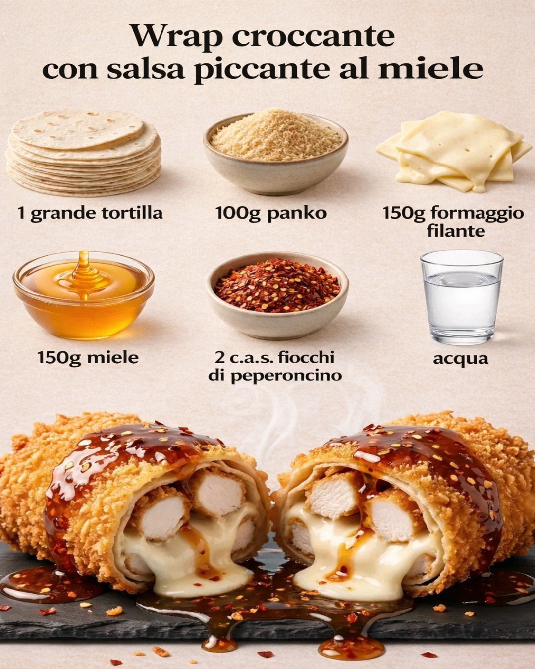 Una ricetta sfiziosa e intensa, perfetta per chi ama i contrasti tra croccantezza, cremosità e una nota dolce-piccante ben presente. La tortilla dorata racchiude un cuore filante, mentre la salsa al miele e peperoncino completa il piatto con carattere e equilibrio.