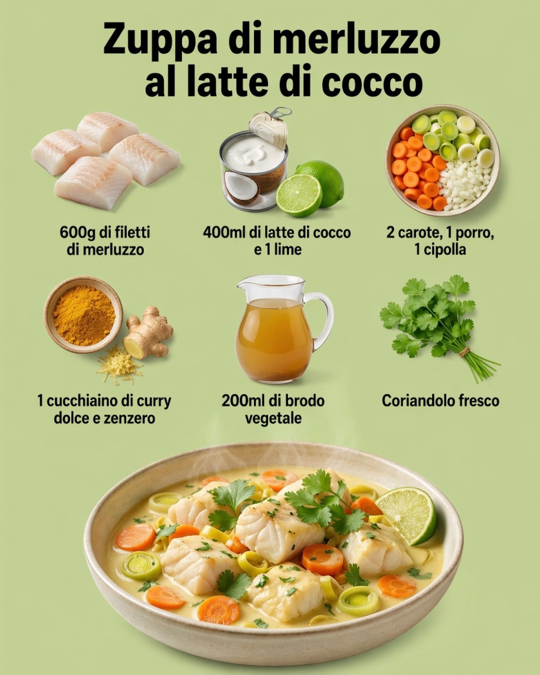 Questa zuppa di merluzzo al latte di cocco è una ricetta delicata e profumata, perfetta per portare in tavola un piatto completo e avvolgente. Il merluzzo si unisce alla cremosità del latte di cocco e alla freschezza del lime, creando un equilibrio morbido e molto piacevole.